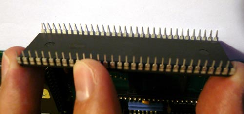 Apoyando contra una superficie plana y aplicando fuerza con los dedos, muy lentamente, iremos corrigiendo el ángulo en ambos lados, hasta que las dos hileras de patillas sean casi paralelas. Siempre sin prisas y sin brusquedades. Si se dobla accidentalmente una patilla, podemos ponerla bien con unas pinzas, siempre con cuidado de no doblar por otro punto y acabar teniendo una patilla en forma de S. Si tenemos tendencia a sudar, utilizamos unos guantes desechables finos, como los usados en el sector sanitario. Como siempre que se opera con electrónica, antes hay que "descargarse" de estática tocando algo metálico. Ojo con los destornilladores imantados, hay que evitarlos.