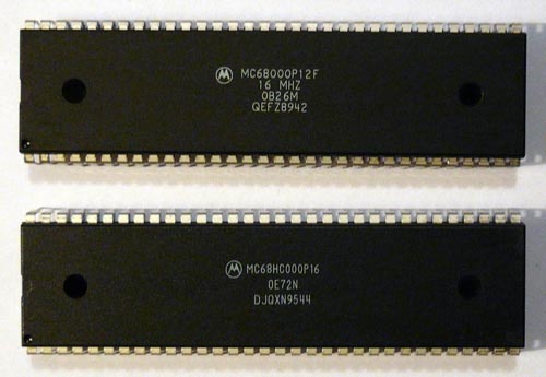 El procesador de Motorola "68000" fue todo un avance cuando se lanzó al mercado a finales de 1979. Era un procesador con registros de 32 bit y un bus de 16 bit. Optimizado para ejecutar código escrito en C y capaz de direccionar 16 Mbyte de memoria. Sin duda pensado para una larga carrera de mejoras futuras y una gran vida comercial útil, como así ha sido. Las primeras versiones se fabricaron con teconología HMOS, encapsulado DIP de 64 patillas y velocidades de 4, 6, y 8 MHz. Este formato DIP64 se mantuvo en producción hasta finales de los 90, aunque Hitachi continúa su producción. La serie 68000 sigue viva bajo la forma de los modernos micro controladores "Dragonball". La compañía que actualmente desarrolla esta y otras familias de procesadores es Freescale Semiconductors, empresa "spin-off" de Motorola. A mediados de los 80 aparecieron las versiones con tecnología CMOS del 68000, diseñadas por Hitachi. Los 68000 con tecnología CMOS son totalmente compatibles con los circuitos diseñados para el 68000, pero con la ventaja de consumir alrededor de 4,5 veces menos a 12 MHz. Un 68000 HMOS original consume 1,35W a cualquier velocidad, mientras que un CMOS consume 0,13W a 8 MHz, 0,23W a 16 MHz y 0,38W a 20 MHz.