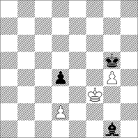 1.Rg2? Excitador inicial: La jugada más aparente ya que gana la pieza. El blanco sólo tiene una opción, Rg3 para tablas. [1.Rg3 Rg6 2.Rg2 Rg5 3.Rxg1 Rxg4 4.Rg2=] 1...Rxg4 2.Rxg1 Rf3 3.Rf1 d3! Dejando al Rey blanco en la primera línea y próximo al zugzwang. 4.Re1 Rg2 5.Rd1 Rf1 6.Rc1 Re2 7.Rb1 Rxd2 Cronometrar al desechar 1.Rg2 |